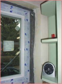 Das Fließ wurde mit dem Mauerwerk mittels einer darauf abgestimmten Nahtpaste verklebt um so die Fenster-anschlussfuge absolut dicht zu bekommen.