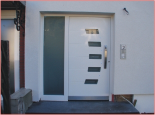 Neben den hochwärmedämmenden Fenstern sollte natürlich auch die Haustür nicht zu kurz kommen. Im Normalfall wird eine Füllung mit einer Stärke von 24mm verwendet. Zur besseren Isolierung haben wir bei dieser Haustür eine beidseitig flügelüberdeckende 80mm Füllung eingebaut. Optisch wirkt die Haustür dadurch größer, da der Flügelrahmen nicht mehr zu sehen ist. Ausgestattet wurde die Tür zusätzlich zum normalem Tür-Zylinder, mit einem elektronischen Öffnungssystem (Fingerscan). Dies ermöglicht dem Kunden ein Zugang ohne Schlüssel. Das Seitenteil wurde mit einem Wärmeschutzglas (satiniert) ausgestattet.